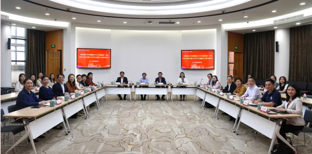 Wang Hao, deputy editor-in-chief of China Daily; Xu Xiaomin, director of China Daily's Shanghai branch; Zhao Xin, deputy party secretary of Shanghai Jiao Tong University; Hu Hao, member of the Party Committee and director of the Publicity Department; Wang Linyuan, party secretary the School of Education and director of the Basic Education Office; Zhou Kai, deputy director of the Publicity Department; Ge Yang, deputy director of the Student Affairs Office; Fan Hongfeng, party secretary and executive principal of the High School Affiliated to Shanghhai Jiao Tong University Minhang Branch, and executive principal of the Second High School affiliated to Shanghai Jiao Tong University; Wu Haiyan, deputy director of the Elementary Education Office and executive vice principal of the Experimental School affiliated to Shanghai Jiao Tong University; Wang Yeting, principal of the Experimental Elementary School affiliated to Shanghai Jiao Tong University as well as representatives of primary and secondary school English teachers; Zheng Sichen, deputy director of the China Welfare Institute Children's Palace; Shang Biwu, dean of the School of Foreign Languages; Zhu Yifan, party secretary of the School of Foreign Languages, as well as the leadership team of the School of Foreign Languages, and colleagues from relevant departments, attended the meeting.