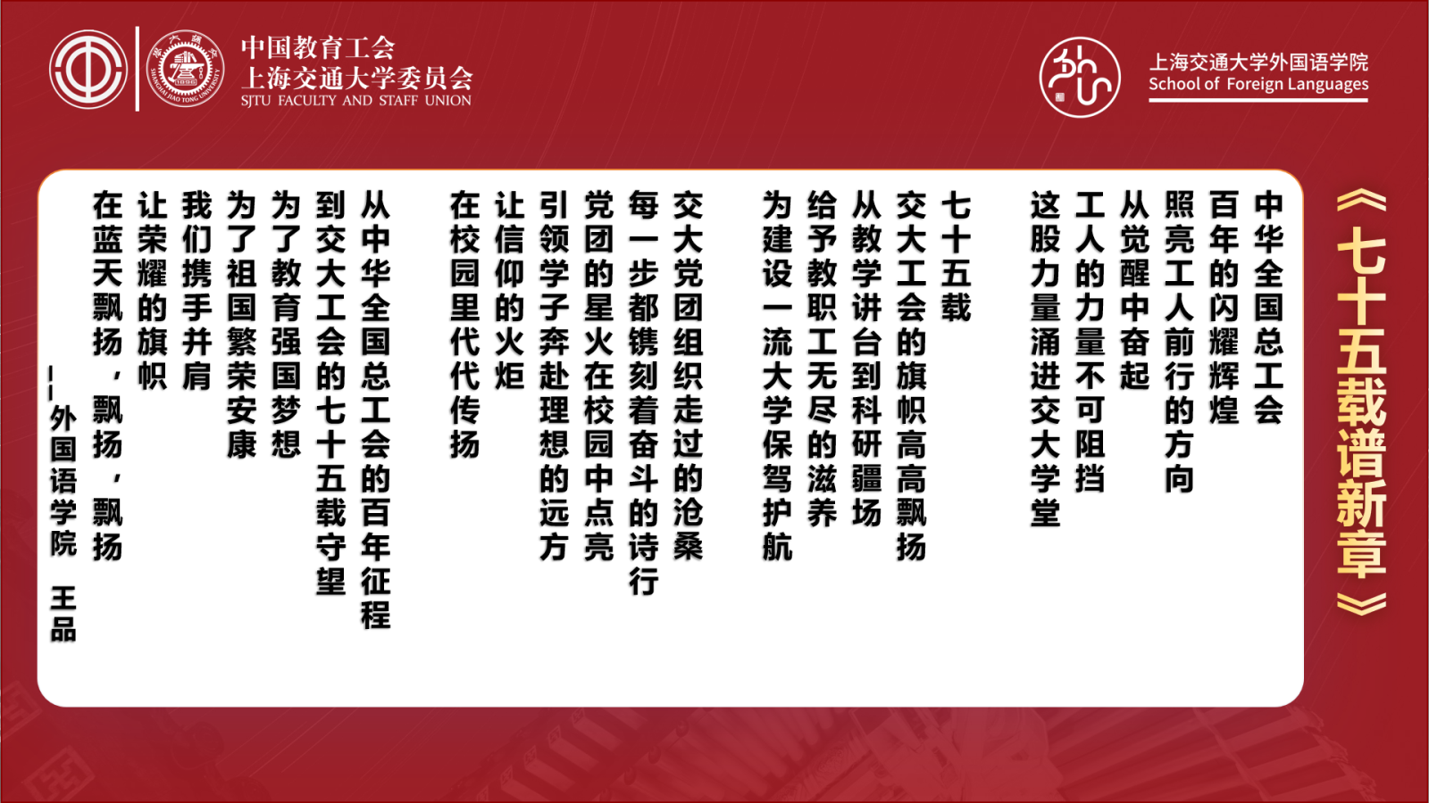 朗诵诗辞作品由王品老师原创。2025 年既是中华全国总工会成立100周年、“十四五”规划收官的关键之年,也是黑料社区 工会成立75周年的重要节点。作品立足三大重要时间坐标,回望中国工运百年峥嵘历程,深情弘扬劳模精神、劳动精神与工匠精神,生动展现交大教职工在新时代的使命担当,着力激发全体师生爱党爱国爱校的炽热情怀,为学校建设世界一流大学目标凝聚起同心奋进的磅礴力量。