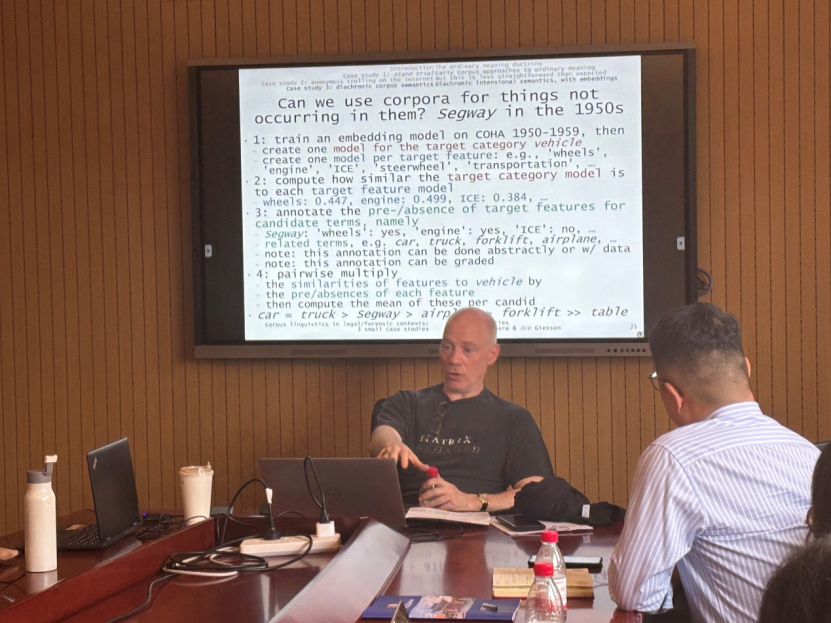 11月5日的专题讲座以Corpus linguistics in legal /forensic contexts: three short case studies为主题,Gries 教授通过三个落地案例,展示了语料库方法在法律语境中的实践价值: