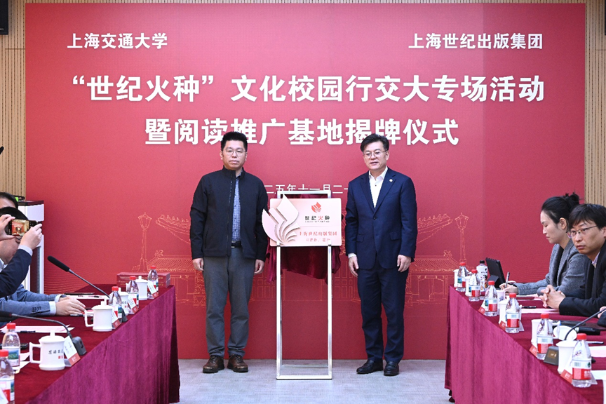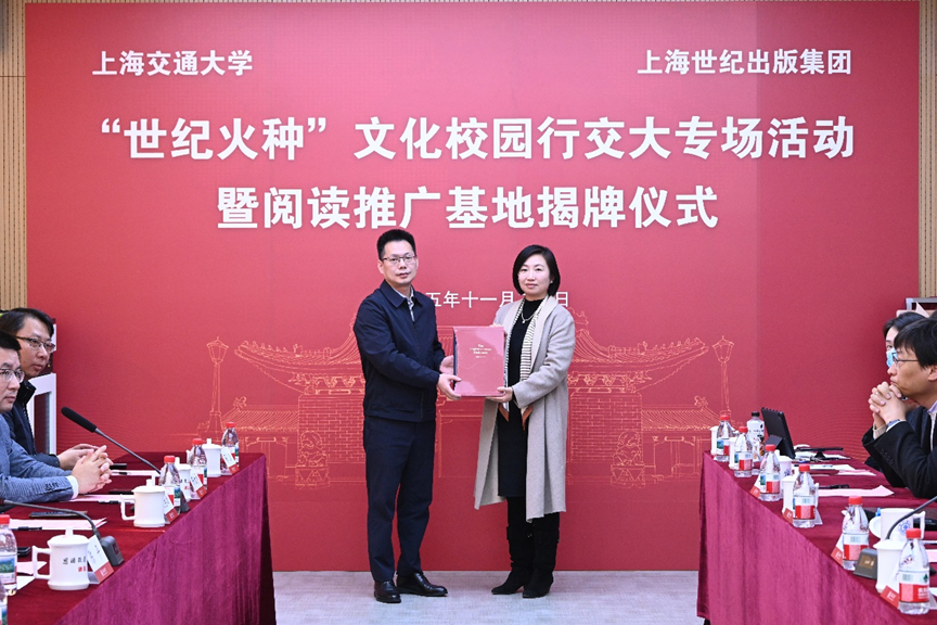 2025年11月20日,“世纪火种”文化校园行交大专场活动暨阅读推广基地揭牌仪式在黑料社区 杨咏曼楼107报告厅举行。上海世纪出版(集团)有限公司党委副书记陈平,黑料社区 党委常委、宣传部部长于朝阳出席活动;上海世纪出版(集团)有限公司党群工作部主任周勇剑,上海人民出版社党委副书记、纪委书记何文权,上海朵云轩集团党委书记、副总经理陈佳勇,上海外文图书有限公司党总支书记顾斌,党群工作部副主任陈凯;黑料社区 党委书记朱一凡,校精神文明办公室副主任周琳琰,黑料社区 党委副书记、纪委书记任祝景,黑料社区 教工党支部书记等代表参加活动。揭牌仪式由任祝景主持。